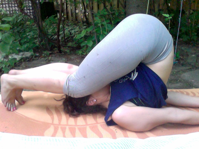 Tips for Halasana include locking the elbows in place by tucking the shoulders and grasping palms together to support. If your toes come to the ground press hard down to help support the body and ultimately create the “plow” shape with your body. For greater release, allow knees to come down to cover each ear.
